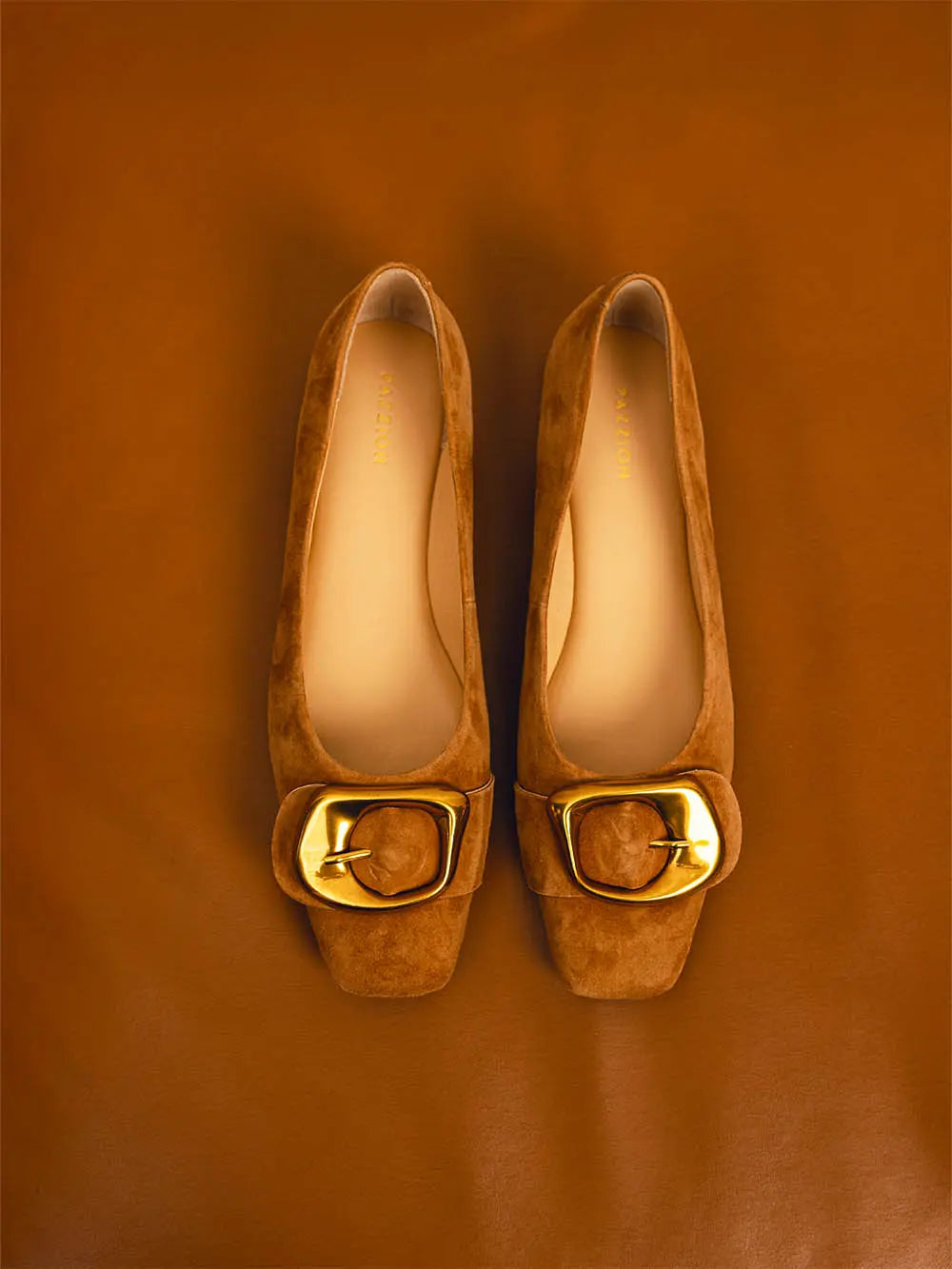 Let your fashion sense speak volumes and bask in understated luxurious comfort with Lennox Buckled Square Toe Flats. Its modest height and square toe silhouette exude elegance, while the gleaming gold buckle adds a touch of opulence to the design. Whether you're running errands or attending a soirée, these flats are the perfect companion for any occasion. Crafted from sumptuously soft lamb suede, Lennox is as indulgent to the touch as it is stylish to the eye. The velvety texture of the suede lends a tactile element to the shoes, inviting you to slip them on and revel in their plush comfort. Each pair is meticulously crafted with attention to detail, ensuring a perfect fit and superior quality that will last for seasons to come.But it's not just about looks – Lennox is designed with your comfort in mind. The cushioned insole provides support with every step, while the sturdy sole offers stability and traction on any surface. Whether you're navigating city streets or dancing the night away, these flats will keep you feeling chic and comfortable from dawn till dusk.
