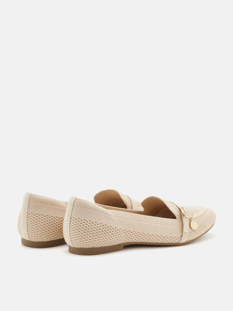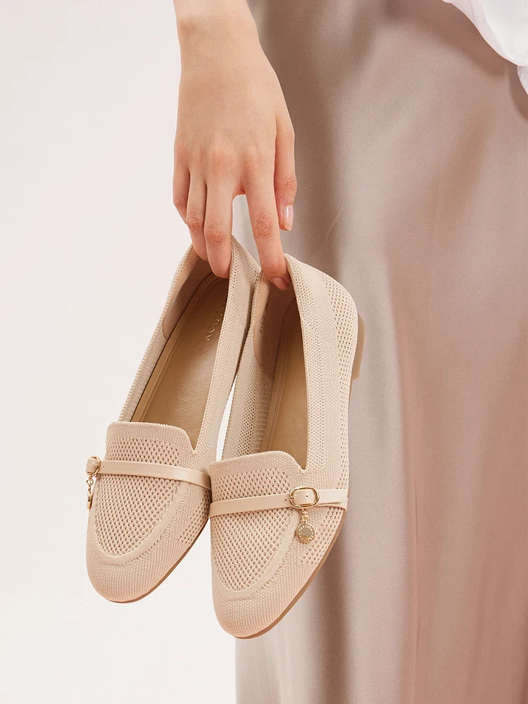 Step into sophisticated comfort with these breathable flyknit loafers. Featuring a modern flyknit upper, plush padded insole, and elegant metal hardware detail, these versatile flats offer both style and comfort for all-day wear. Available in classic black and almond colorways.