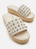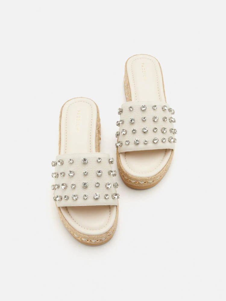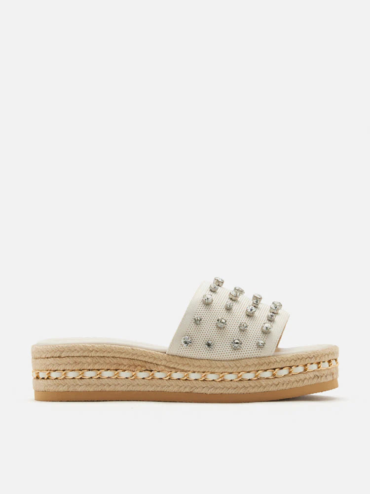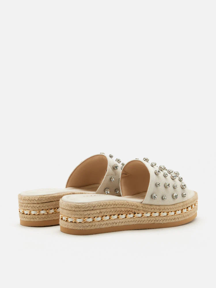 Ideal for relaxed days, these wedges showcase leather looped chain details, a woven raffia lower sole, a fly knit vamp, and sparkling crystal embellishments, adding a distinctive flair to any outfit. In soft beige and pink, they provide effortless versatility, making them perfect for a wide range of pairings.