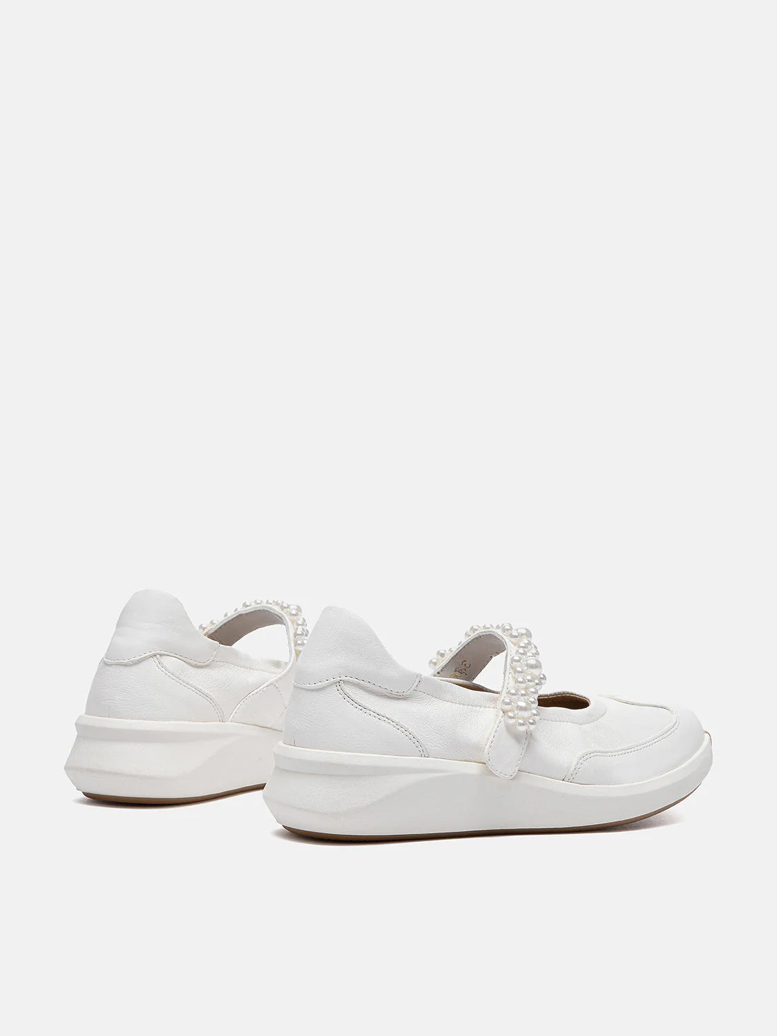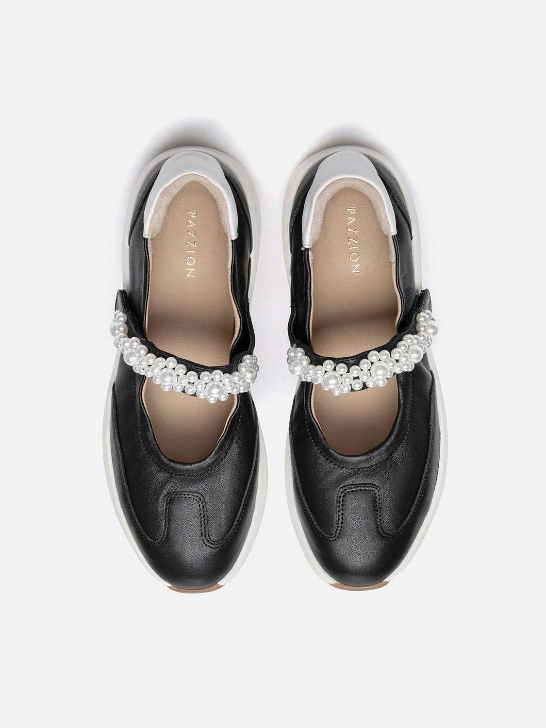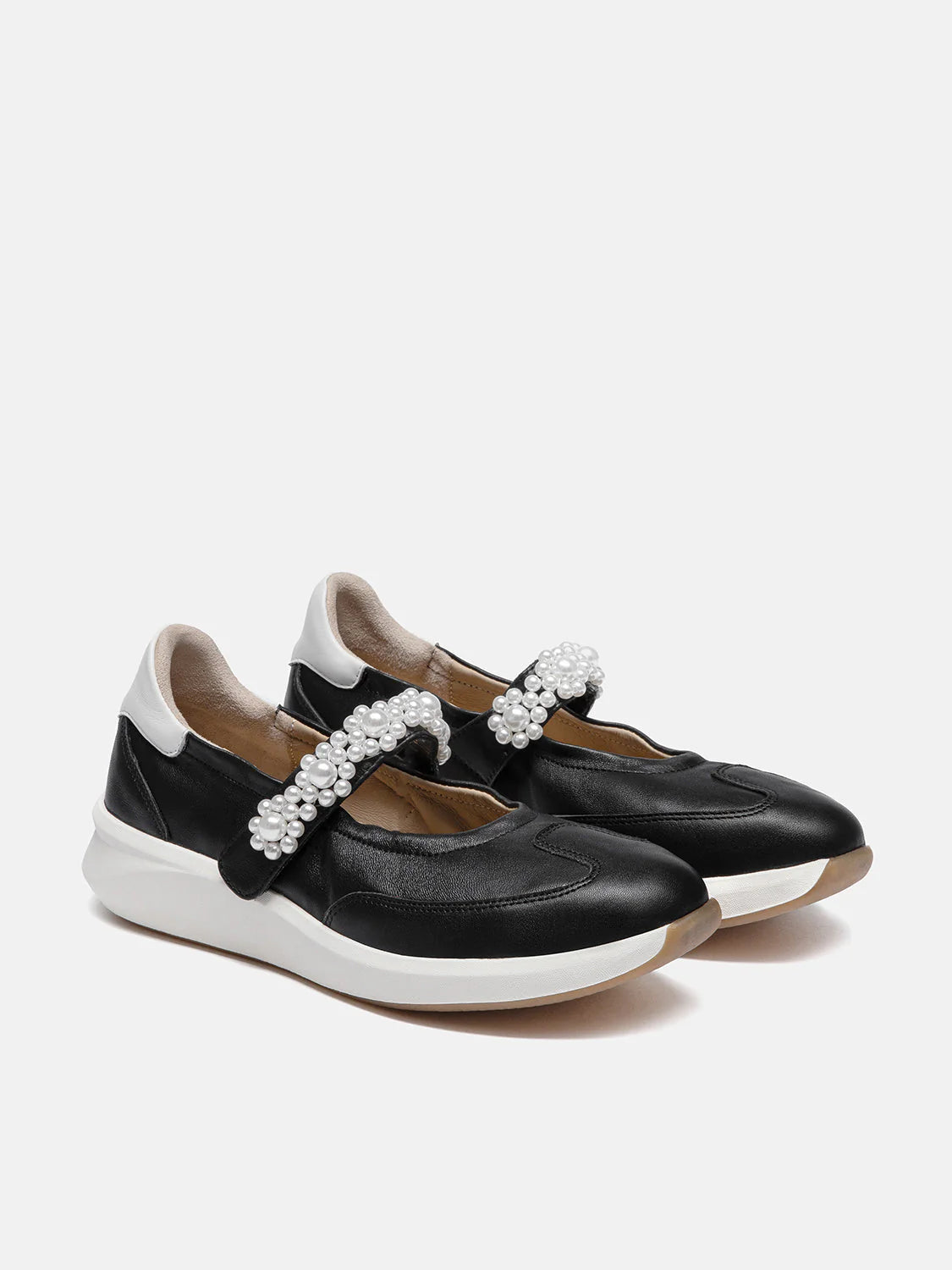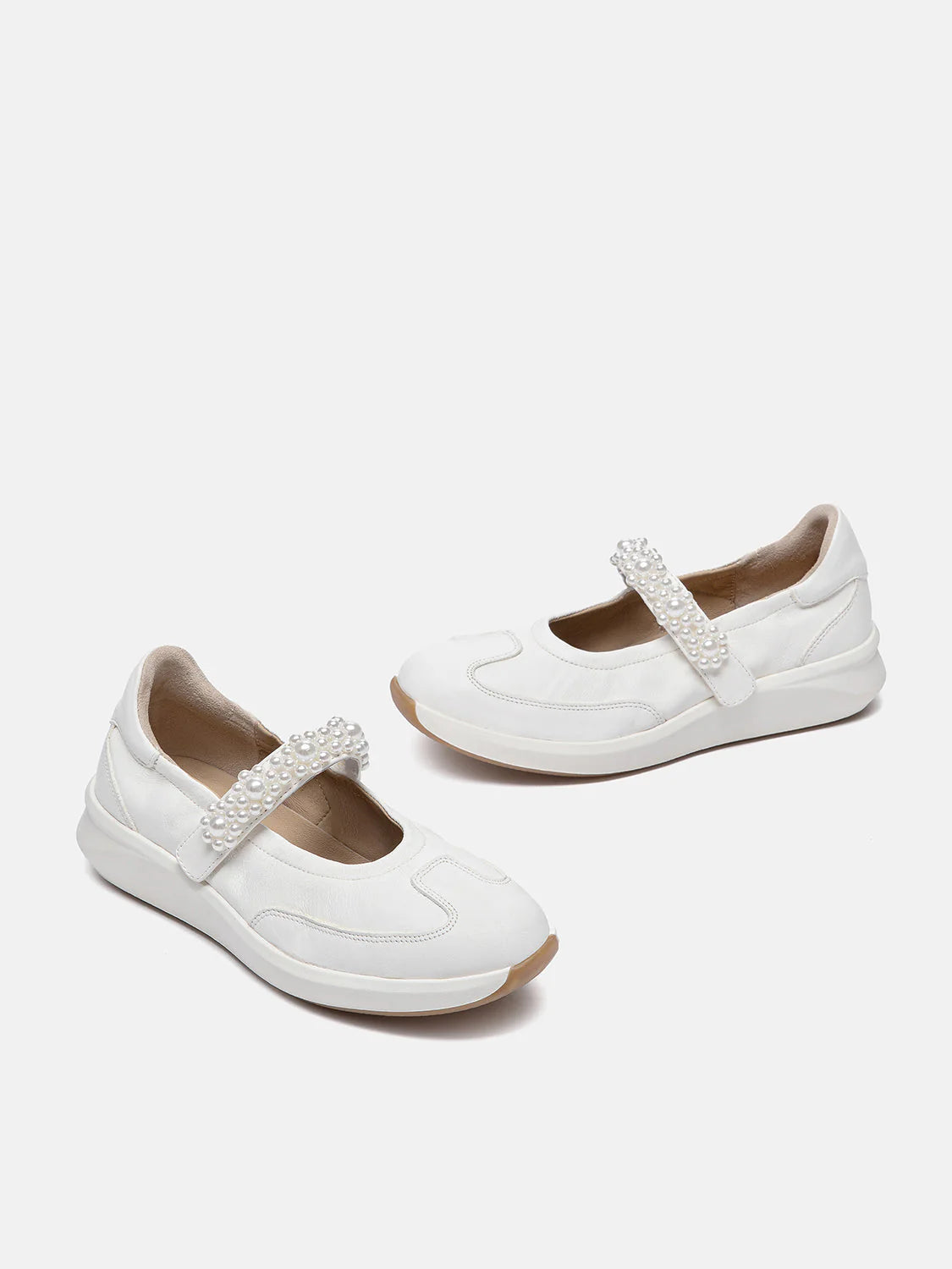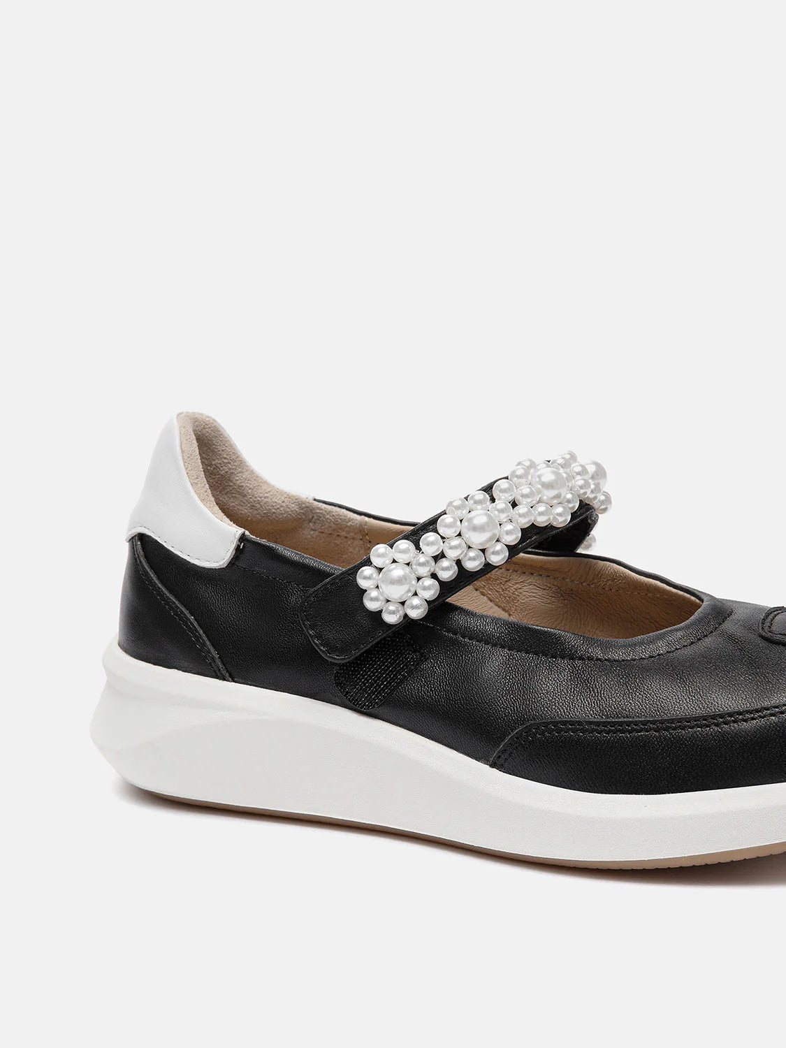 Made from soft lambskin, these Mary Jane flats come with a unique strap decorated with pearl beads for a touch of elegance. The padded back cushion adds extra comfort, making them perfect for all-day wear.