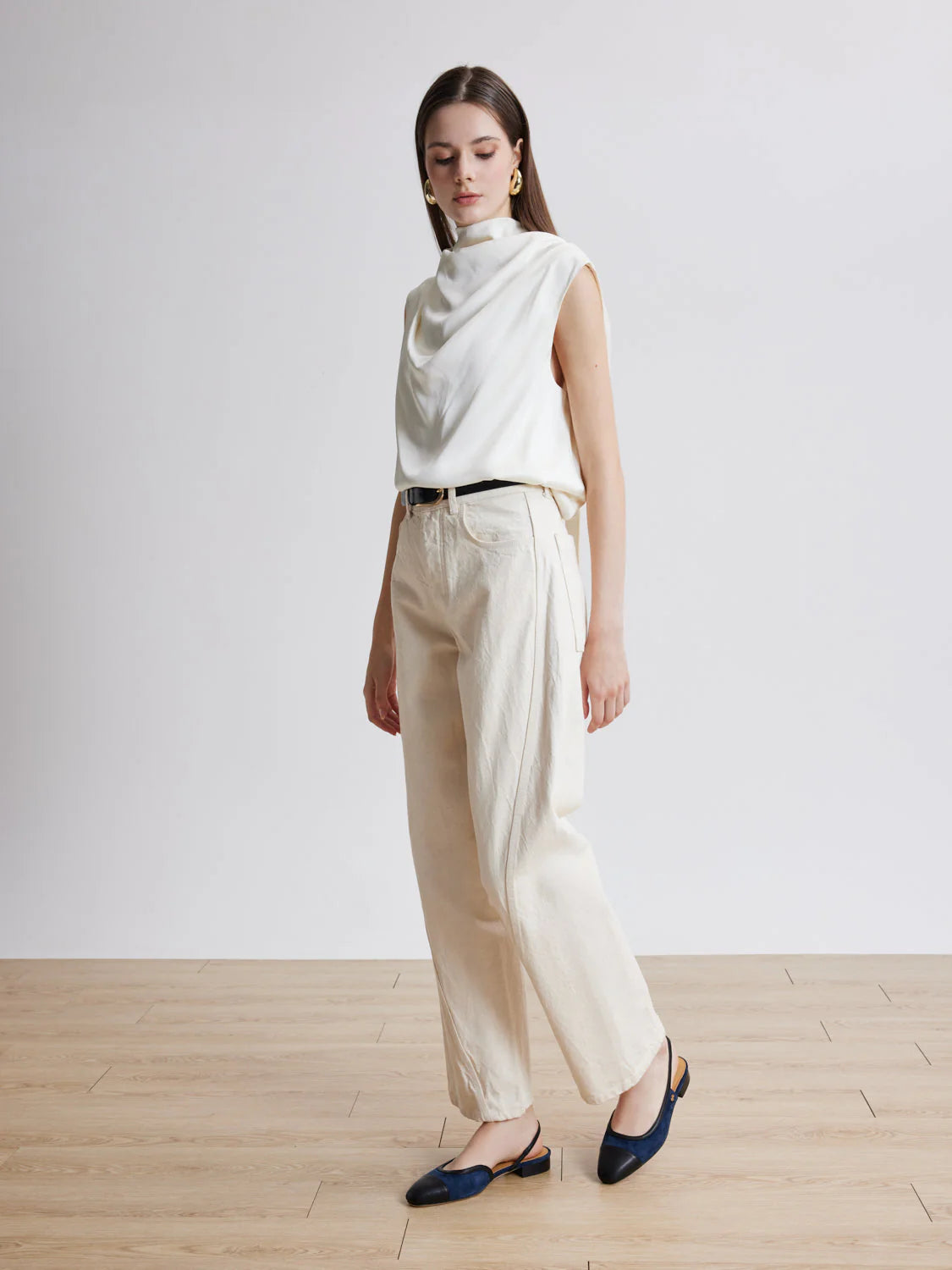 The Hanneli slingback flats embody refined minimalism with a striking two-tone design, blending sumptuous lamb suede with sleek black lambskin toe caps for a captivating contrast. The silhouette is elevated by the subtle iconic double-P PAZZION gold logo hardware, discreetly placed on the suede side, adding a signature touch of quiet luxury.