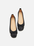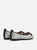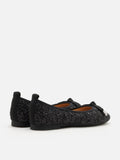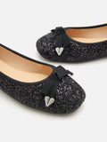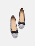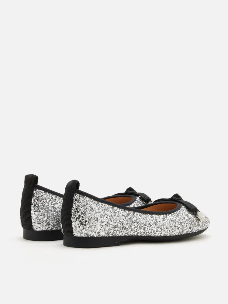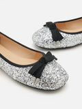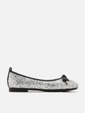 The classic charm of ballerina flats is enhanced with glitter fabric, complemented by delicate bow details and a luxurious lambskin insole, offering a refined look with a touch of sparkle and exceptional comfort.