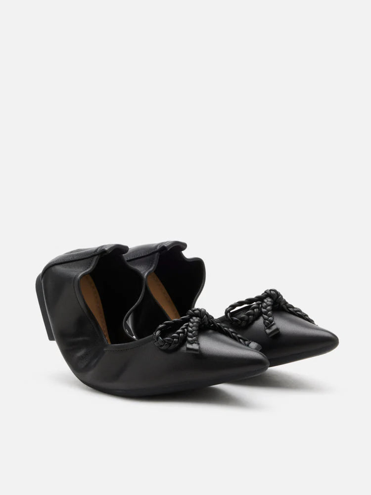 These foldable flats exude refined minimalism with their luxurious lambskin upper and delicate braided bow at the pointed toe. Designed for effortless grace and ultimate convenience, their compact foldability and cushioned lambskin lining ensure all-day comfort without compromising style. A versatile choice that blends quiet luxury with functional ease for the contemporary wardrobe.