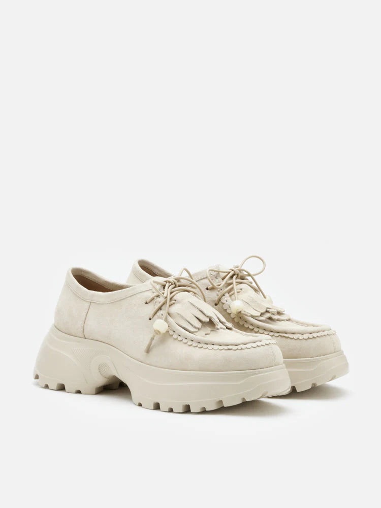 Exude refined minimalism with Maeve, crafted from sumptuous lamb suede in warm beige and cool camel hues. These loafers marry classic design with contemporary functionality, featuring a distinctive fringed tongue adorned with soft leather ties. The padded cushion at the shoe tongue ensures exceptional comfort, while the durable rubber outsole offers sturdy support and mobility, embodying quiet luxury and effortless grace.