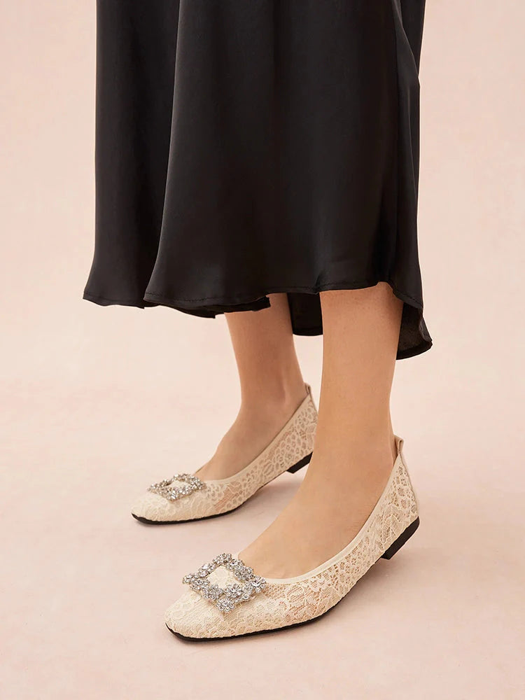 PRODUCT DESCRIPTION Meet Alina — where elegance meets effortless convenience. Crafted for the modern woman on-the-go, these foldable flats feature a soft, flexible construction that doesn’t compromise on style. The romantic lace overlay exudes vintage charm, while an oversized, dazzling diamante embellishment takes center stage at the toe, adding a...