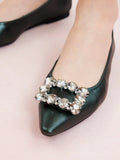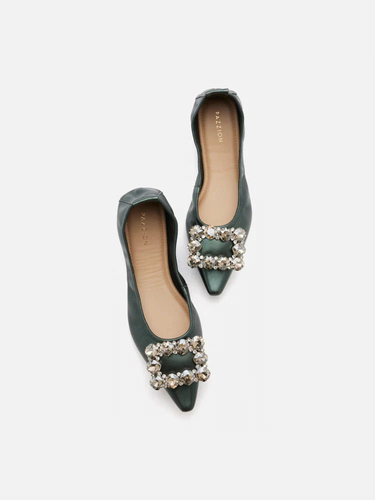 Crafted with metallic lambskin uppers and adorned with jewel-buckled accents, these shoes feature an elegant pointed-shaped toe. Perfect for travel, they seamlessly blend style, comfort, and convenience, making them ideal for both occasions and events. Their foldable design ensures easy storage and portability.