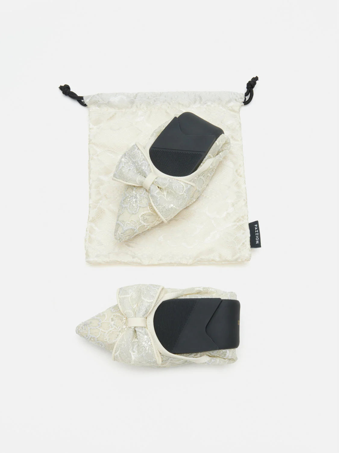 Vera embodies a delicate balance of quiet luxury and uncompromising grace, designed for the discerning woman on the move. These pointed foldables feature intricate lace fabric embroidered with subtle floral motifs for a timeless yet fresh allure. The oversized bow at the vamp enhances the understated sophistication, while the lambskin lining ensures a soft, breathable fit.