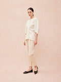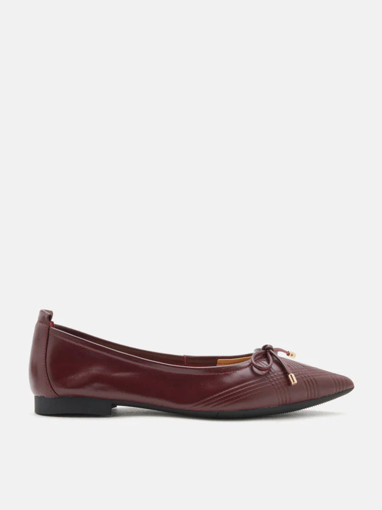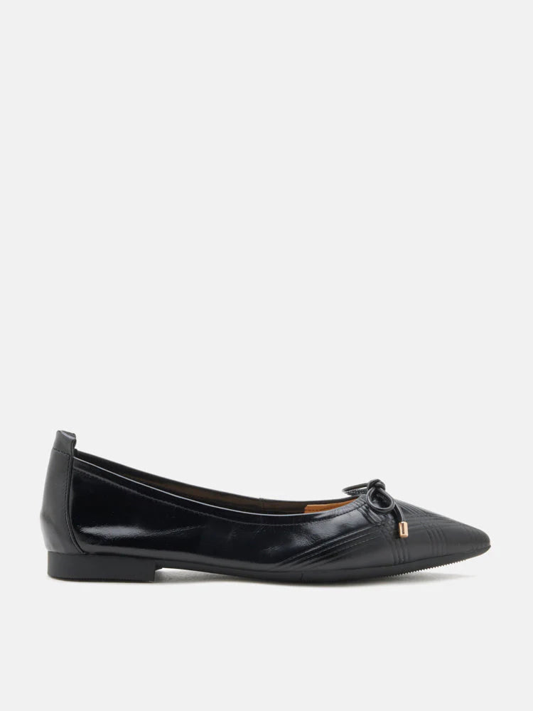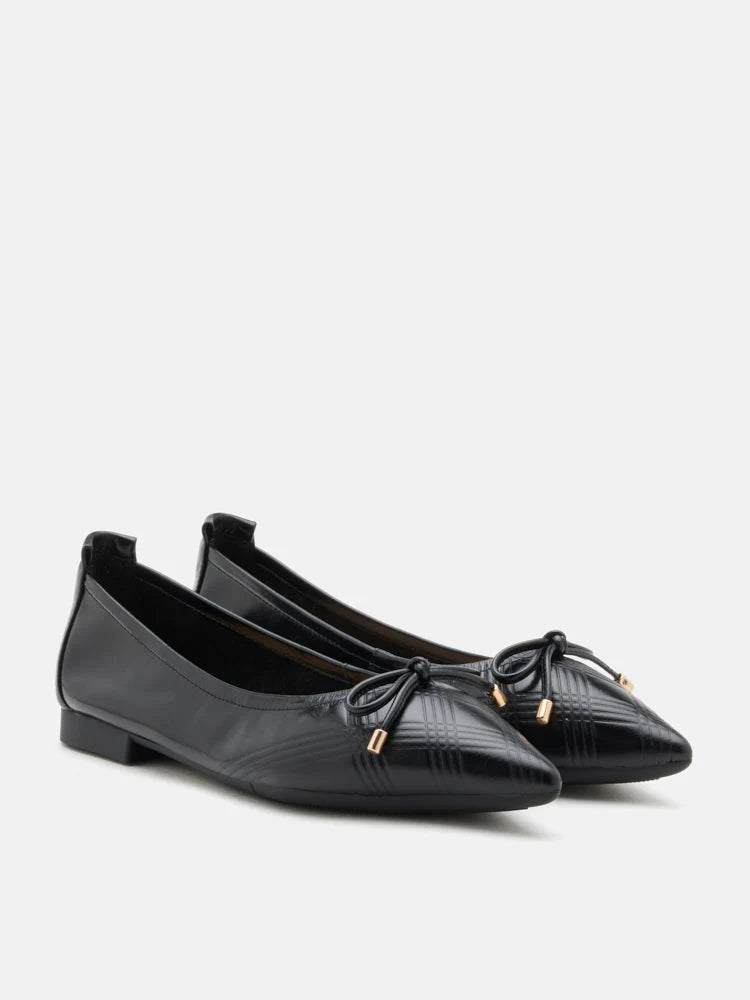 These flats feature a sleek and pointed toe design, giving them a sophisticated, modern look. The main design element is a delicate bow placed near the toe, tied with a subtle knot and finished with metallic tips that add a polished touch. The exterior of the flats showcases a textured, crisscross pattern that adds depth and visual interest to the shoe's smooth, polished surface. Crafted with a soft and flexible outsole, Sienna is designed to be easy on the feet for extended wear. Perfect for both casual and formal settings, these flats combine a chic aesthetic with everyday practicality.