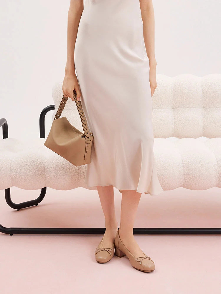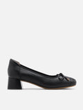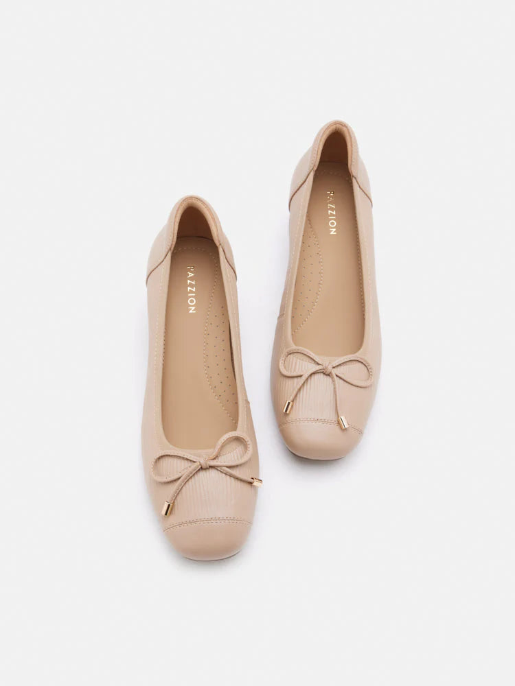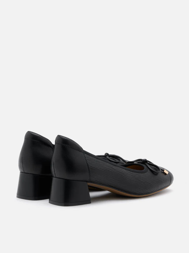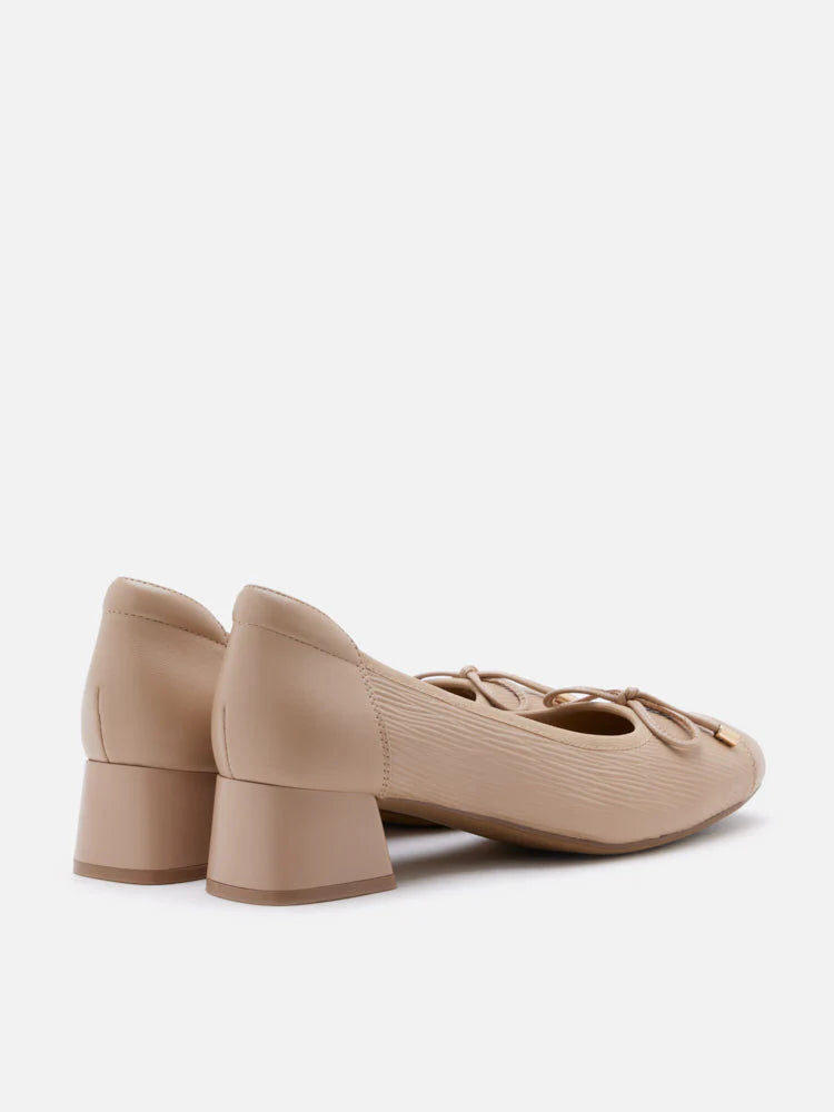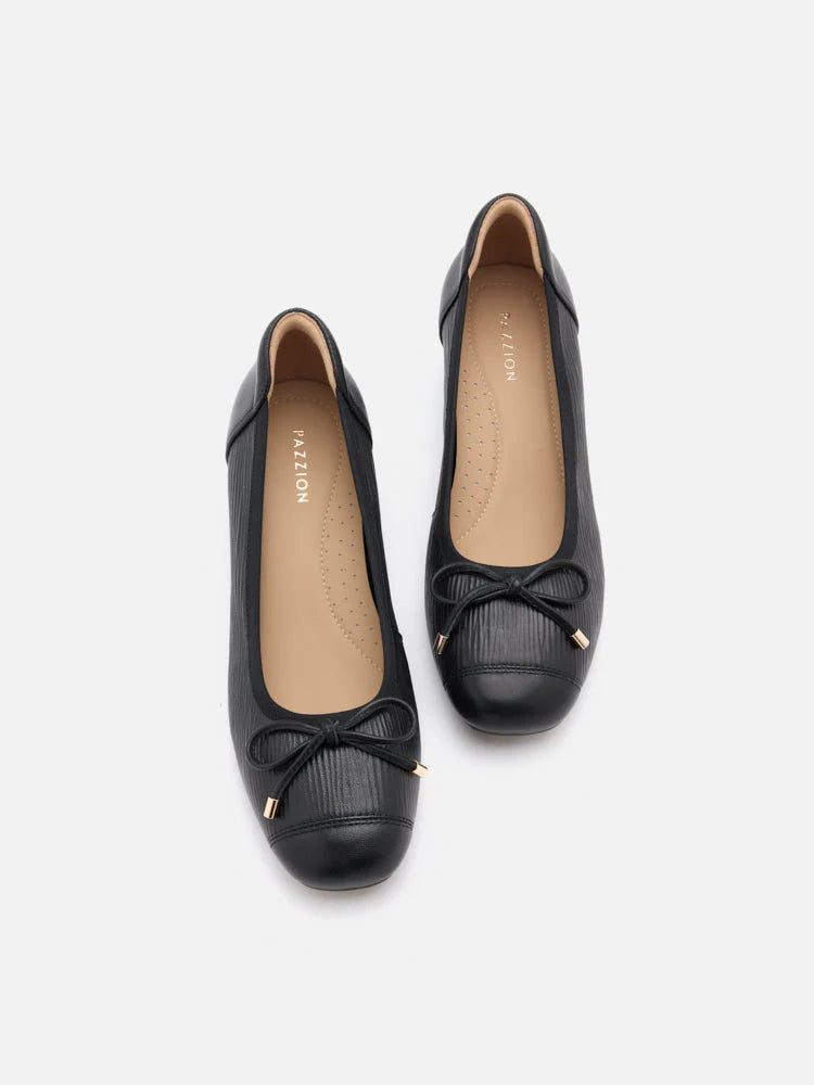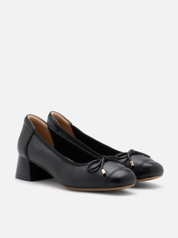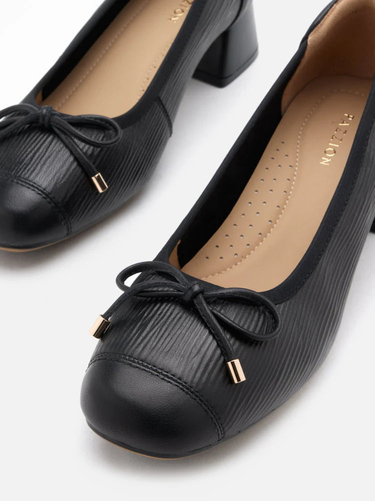 Elegant and timeless, these low heels are a masterful balance of craftsmanship and sophistication. The delicate ribbon at the front is elevated with metallic accents at the tips, adding a refined touch of modernity. A textured finish and stitched toe cap detail enhance the silhouette with tactile depth. Designed for enduring comfort, the breathable insole with arch support and pillow cushioning at the back create a luxurious fit, ensuring all-day ease with every step. A statement of effortless grace, perfect for elevating any ensemble.