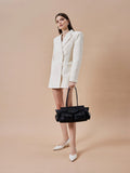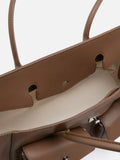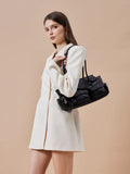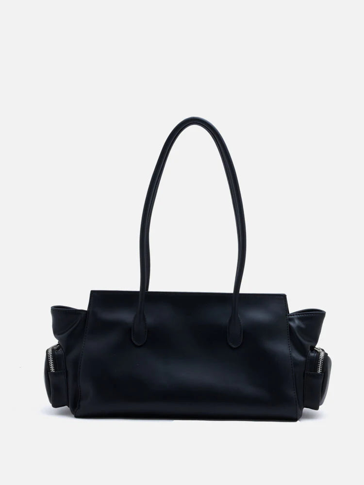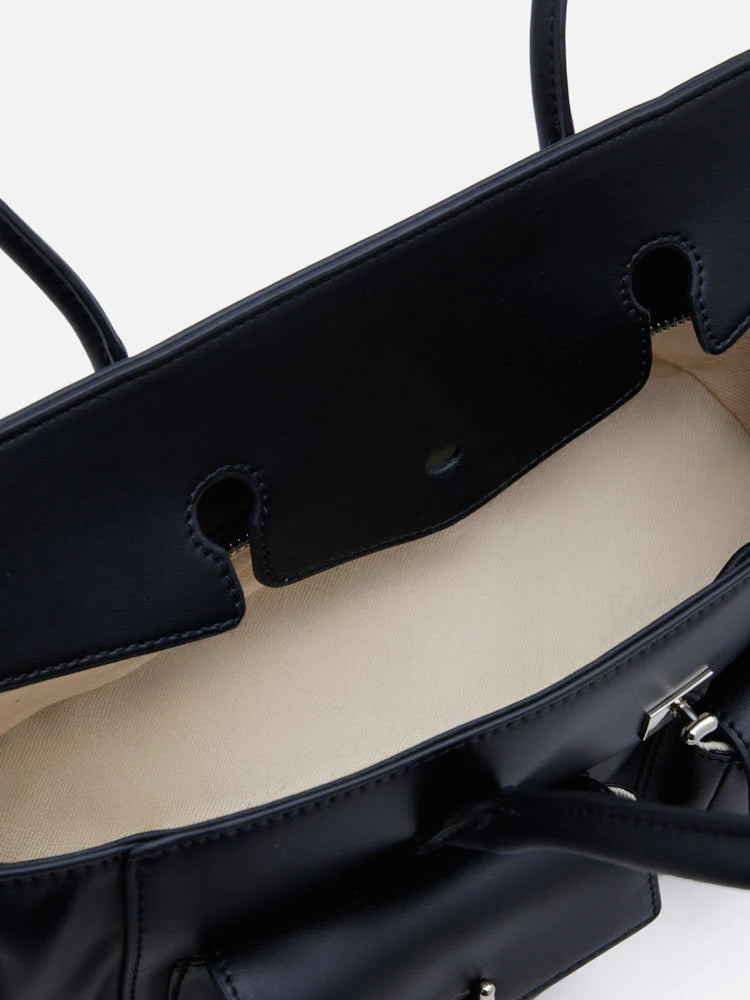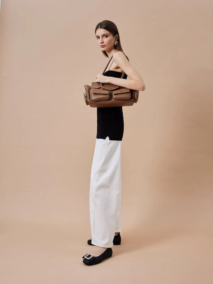 Virelle exemplifies utilitarian appeal with its architectural silhouette and clean lines. Featuring functional front flap pockets secured with delicate clasp hardware, this structured piece offers effortless grace and timeless allure. Designed for one-way wear with comfortable long handles, it seamlessly balances everyday practicality with classic modernity.